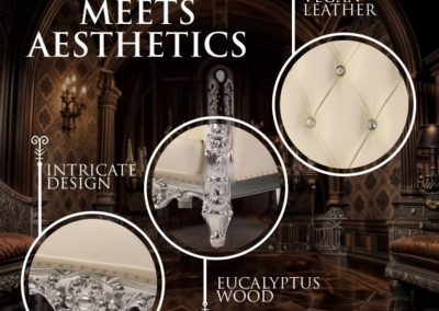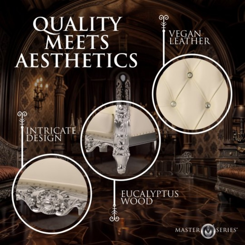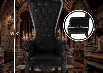 Sit Like Royalty: This ornate, plush, cushioned chair with Victorian-style wood carvings gilded in shining silver is an opulent, striking display of power, elegance, and authority. Wooden Frame: The durable, wooden frame is made out of eucalyptus wood. Plush Upholstered Cushions: The tufted backing and plush cushions of this vegan-leather-covered chair are dappled with glass buttons between each tuft.